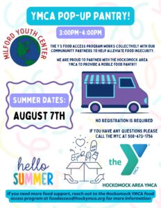 The Milford Youth Center would also be continuing our collaboration with the Hockomock Area YMCA and their Food Access Program! Together, we will provide a Mobile Food Pantry monthly for members and their families. We are proud to announce that from September through June, 300 bags of groceries were distributed by the YMCA mobile food truck at the MYC location.