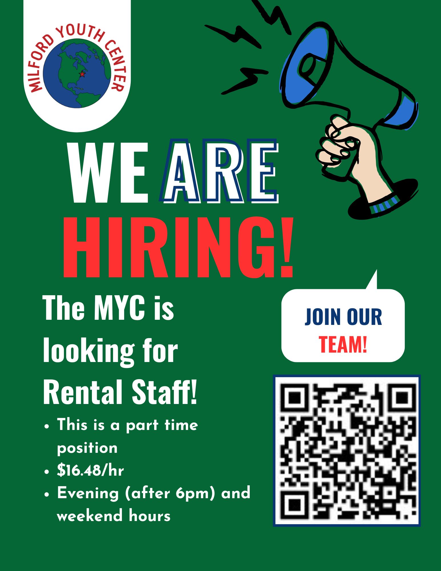 The Milford youth Center is looking for reliable, responsible, night and weekend part-time help! The rate for this position is $16.48/hour, with an estimate of 19 hours or less each week. Applicants must be at least 16 years of age and be comfortable working nights (after 6pm) and weekends (based on rental requests and/or community events)!