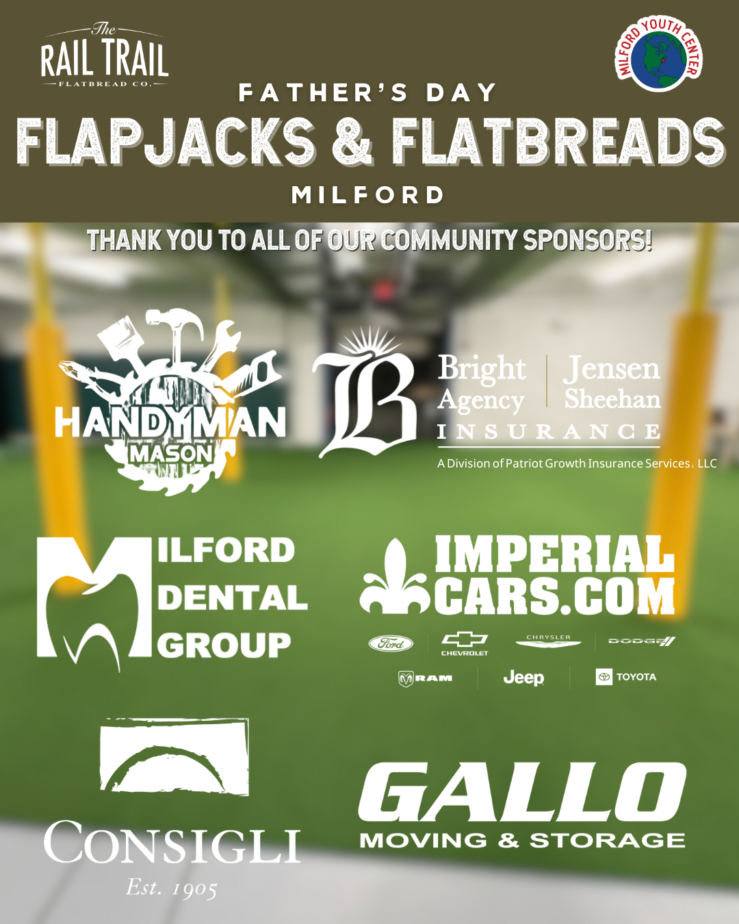 We are so excited to share that due to the incredible support of our Milford community, sponsors (Consigli Construction, Milford Dental Group, Bright Insurance, Handyman Mason, Imperial Cars Mendon, Gallo Moving & Storage), and every guest who donated during Rail Trail’s Father’s Day Fundraiser, the Milford Youth Center has officially upgraded our turf flooring!