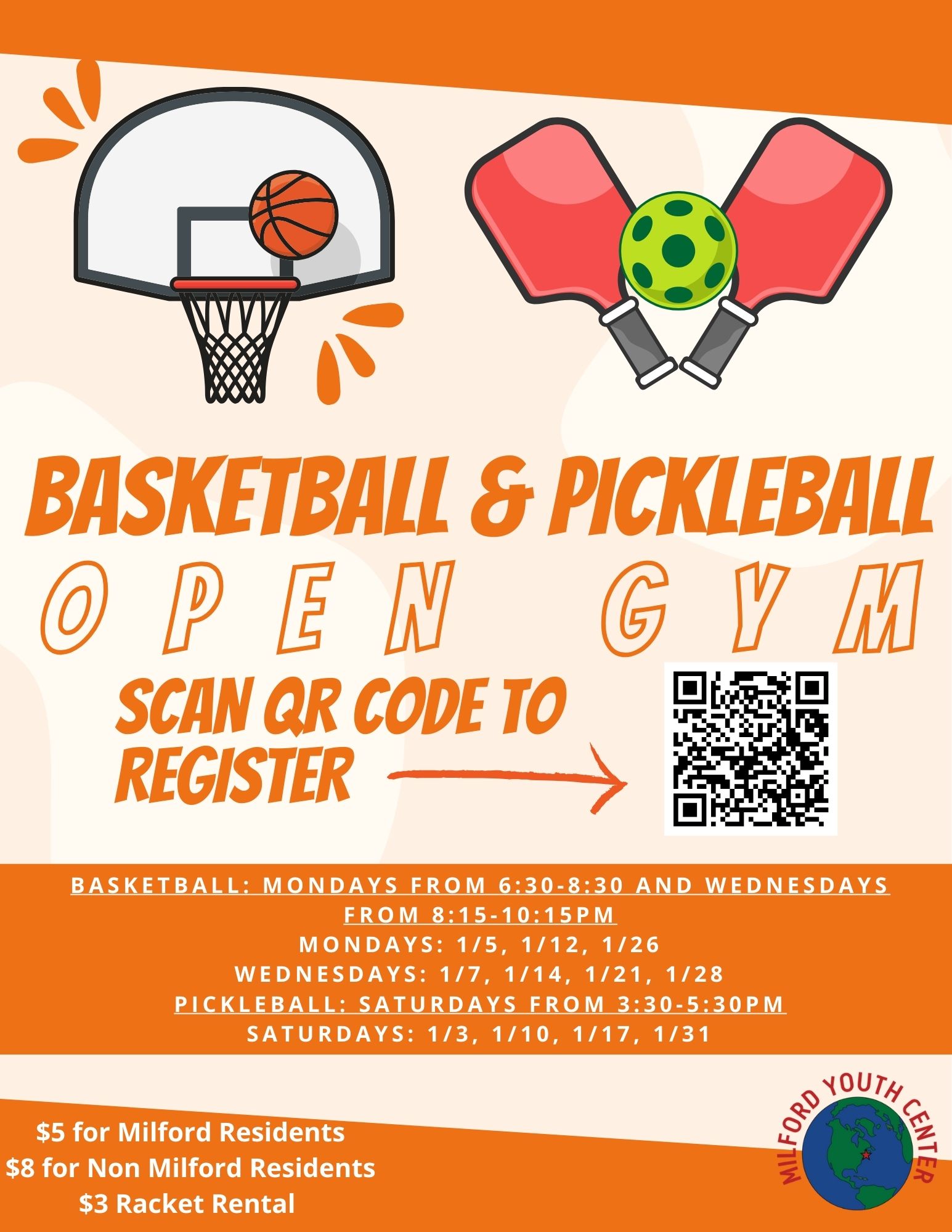 Milford residents will be charged $5 each and out-of-town participants will be charged $8 each week (please bring the exact amount)!