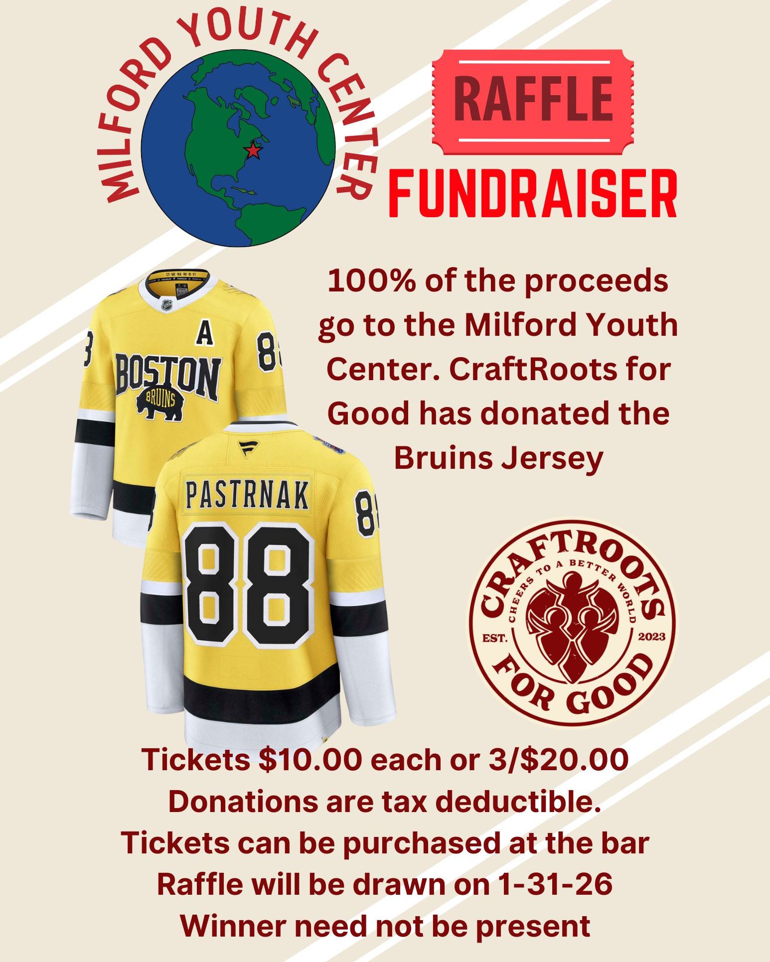 During the month of January, CraftRoots Brewing will be raffling off an official Bruins Jersey!- Tickets will be $10 each or 3/$20 and all donations will be going directly to the Milford Youth Center. The Boston Bruins jersey has been donated for this cause so that all money raised will be given to Milford Youth Center to help raise money for a 3D printer!