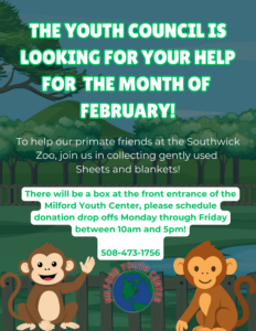 The MYC Youth Council will be holding a collection during the month of February! We will be collecting donations on behalf of the Primate Department of Southwick’s Zoo in Mendon. They are currently asking for gently used sheets and blankets.