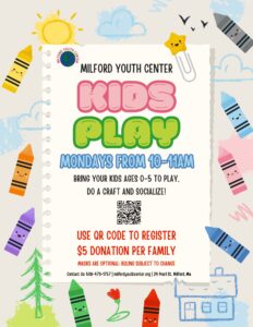 It is required for Kids Play parents, who are planning on attending with their child, to RSVP by the Friday by 1pm prior to the Kids Play date to Joanna Abrantes, the Program Coordinator at jabrantes@milfordma.gov.