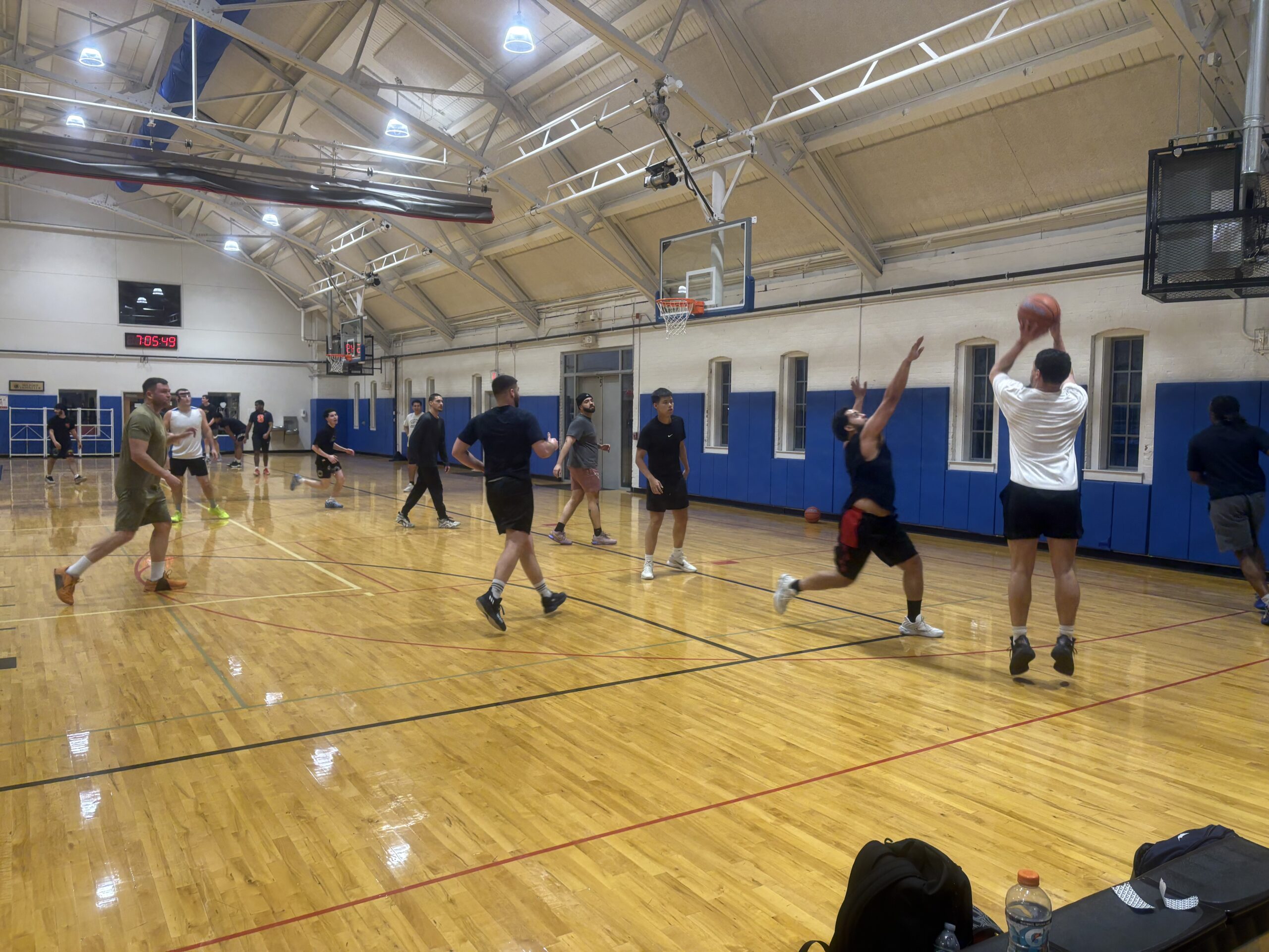 This is pickup basketball, where players shoot for teams to start. Depending on number of participants, there will be two small courts running games and/or the full court (the program will be tentatively half court if scheduling changes).